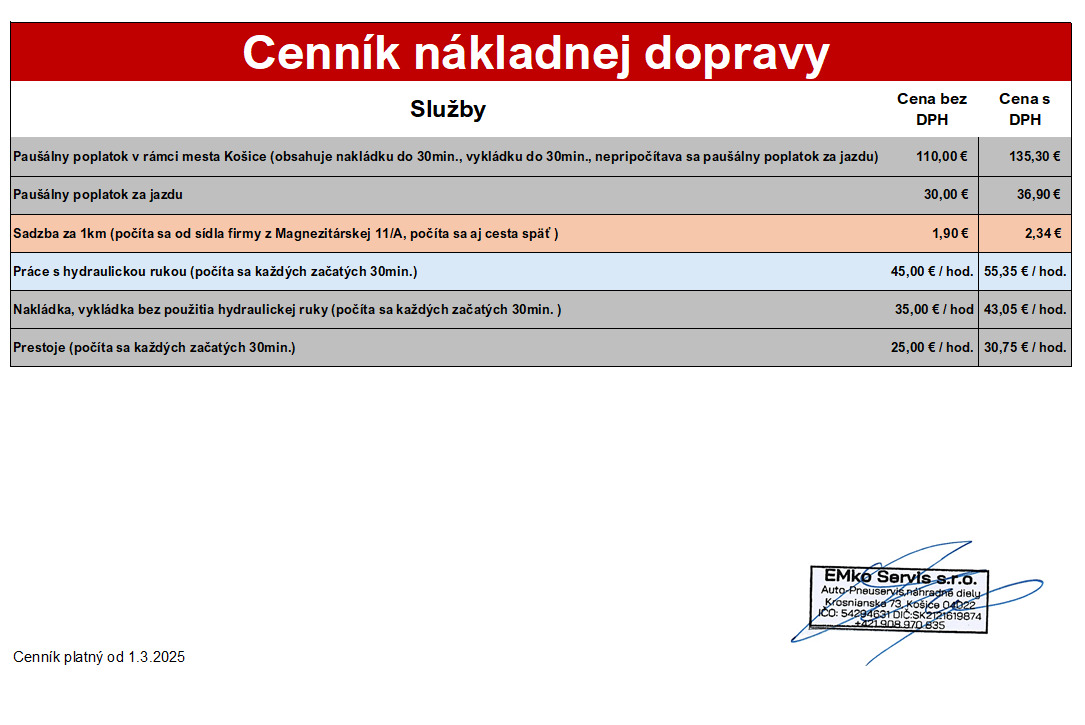 V našej spoločnosti EMko Autodoprava sa špecializujeme na prepravu tovaru s hydraulickou rukou a prepravu vozidiel. Zabezpečujeme rýchle a bezpečné doručenie tovaru, materiálu alebo vozidla do miesta určenia. Náš cenník je flexibilný a prispôsobíme sa individuálnym potrebám a požiadavkám našich zákazníkov.